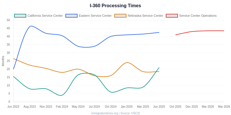 Current USCIS I-360 processing times range from 21.5 mo to 29.3 mo depending on the service center. This data is updated daily from USCIS official processing time estimates.