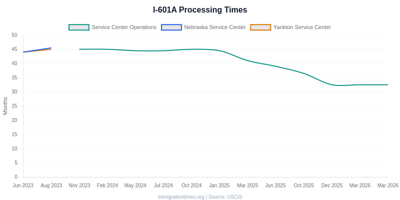 Current USCIS I-601A processing times range from 27.0 mo to 32.5 mo depending on the service center. This data is updated daily from USCIS official processing time estimates.
