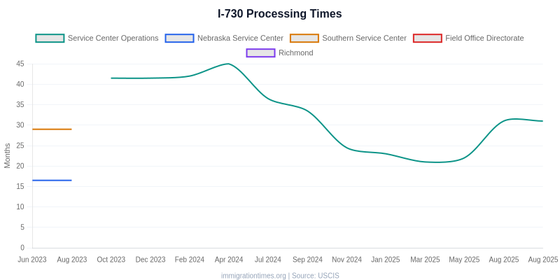 Current USCIS I-730 processing times range from N/A to N/A depending on the service center. Updated Mar 29, 2026.