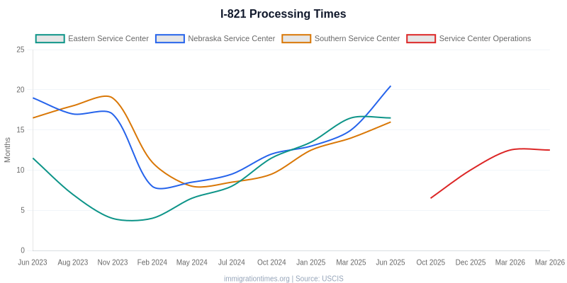 Current USCIS I-821 processing times range from 12.9 mo to 20.0 mo depending on the service center. Updated Mar 29, 2026.