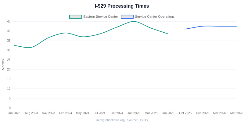 Current USCIS I-929 processing times range from 35.0 mo to 42.5 mo depending on the service center. Updated Mar 29, 2026.
