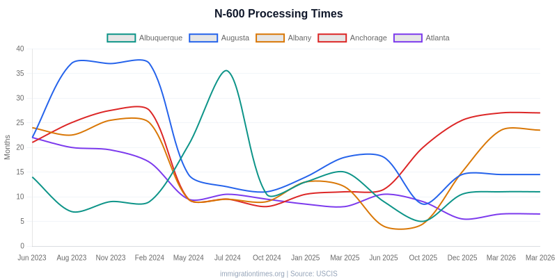 ImmigrationTimes.org. (2026). N-600 Processing Times. Retrieved Mar 29, 2026, from https://immigrationtimes.org/forms/n-600/